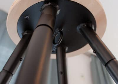Der Aufbau geht wunderbar einfach und turboschnell. Es müssen einfach die Stangen zusammengesteckt werden. Je Bein gibt es ein unteres und ein oberes Element. Das jeweils untere Teil erkennst du an dem Plastikfuss (schau mal auf das Bild unten). Das obere Element wird in die Krone gesteckt. Insgesamt werden dir also 8 Elemente für 4 Beine geschickt.